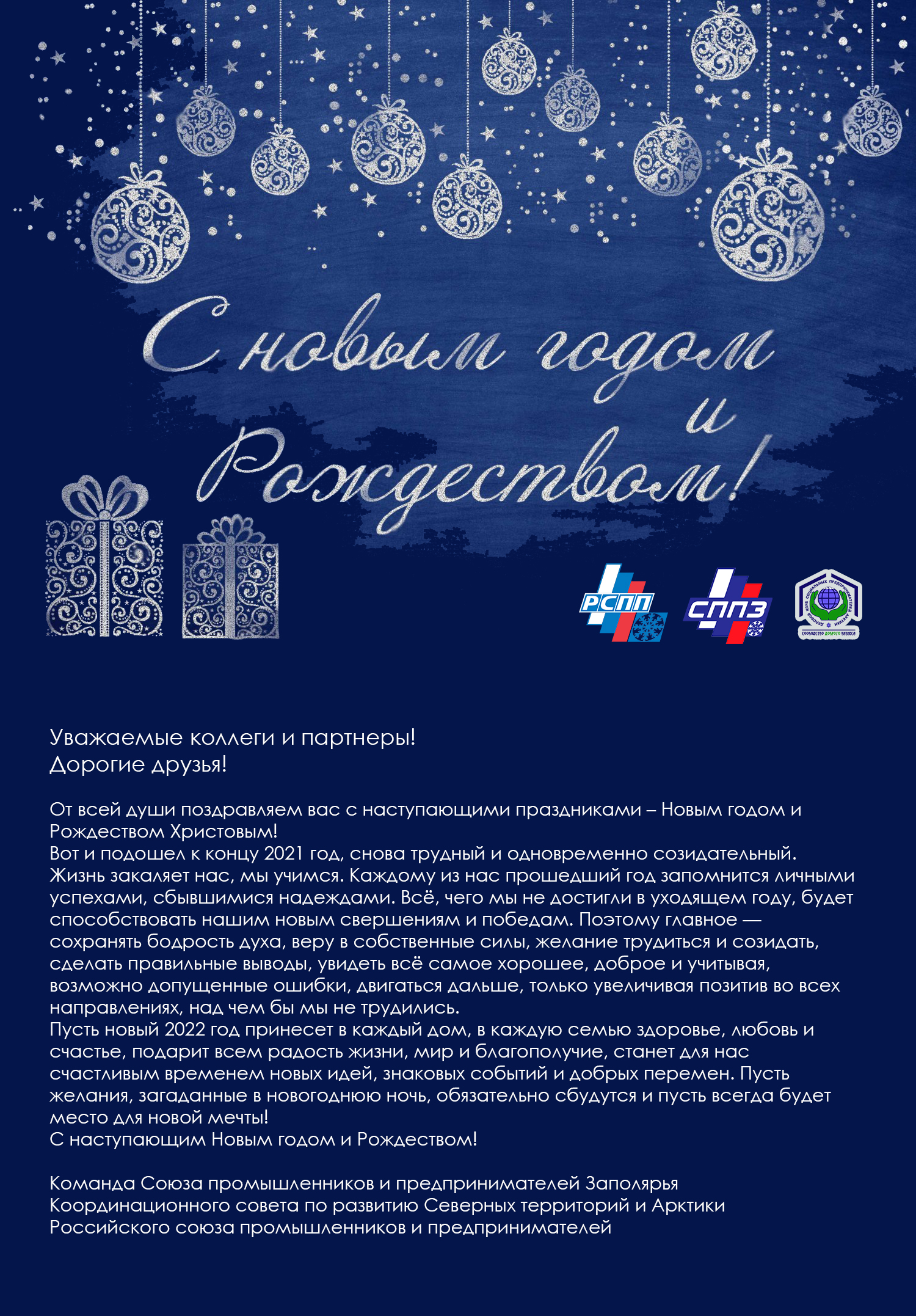 От всей души поздравляю членов Союза «Северные промышленники и предприниматели», Союза предпринимателей «Поддержка», всех наших друзей, коллег и партнеров с наступающим Новым годом и Рождеством Христовым!