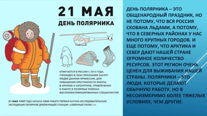 В этот день мы поздравляем представителей самых разных «полярных» профессий: ученых и исследователей, геологов, строителей, медиков, моряков, летчиков, океанологов и гляциологов, метеорологов, газо- и нефтедобытчиков, горняков и металлургов, работающих в вечной мерзлоте.